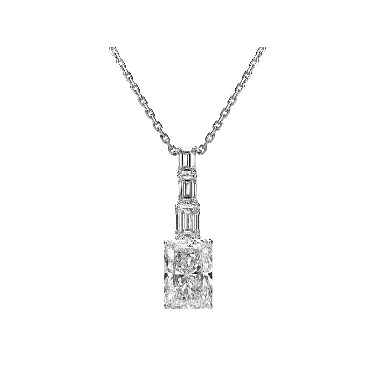 Gracing the Champs-Elysees collection, this architectural 18K white gold masterpiece suspends a spectacular 7.53 carat radiant lab-grown diamond. A cascading line of emerald and round lab-grown diamonds elegantly elevates the brilliant drop, totaling 9.91 carats.