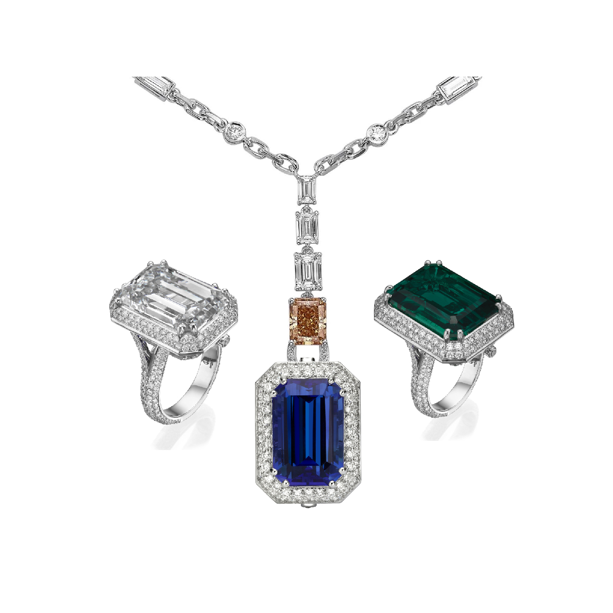 and expression. This exceptional piece features 3 interchangeable center stones: Emerald, Diamond, and Tanzanite. Each stone is