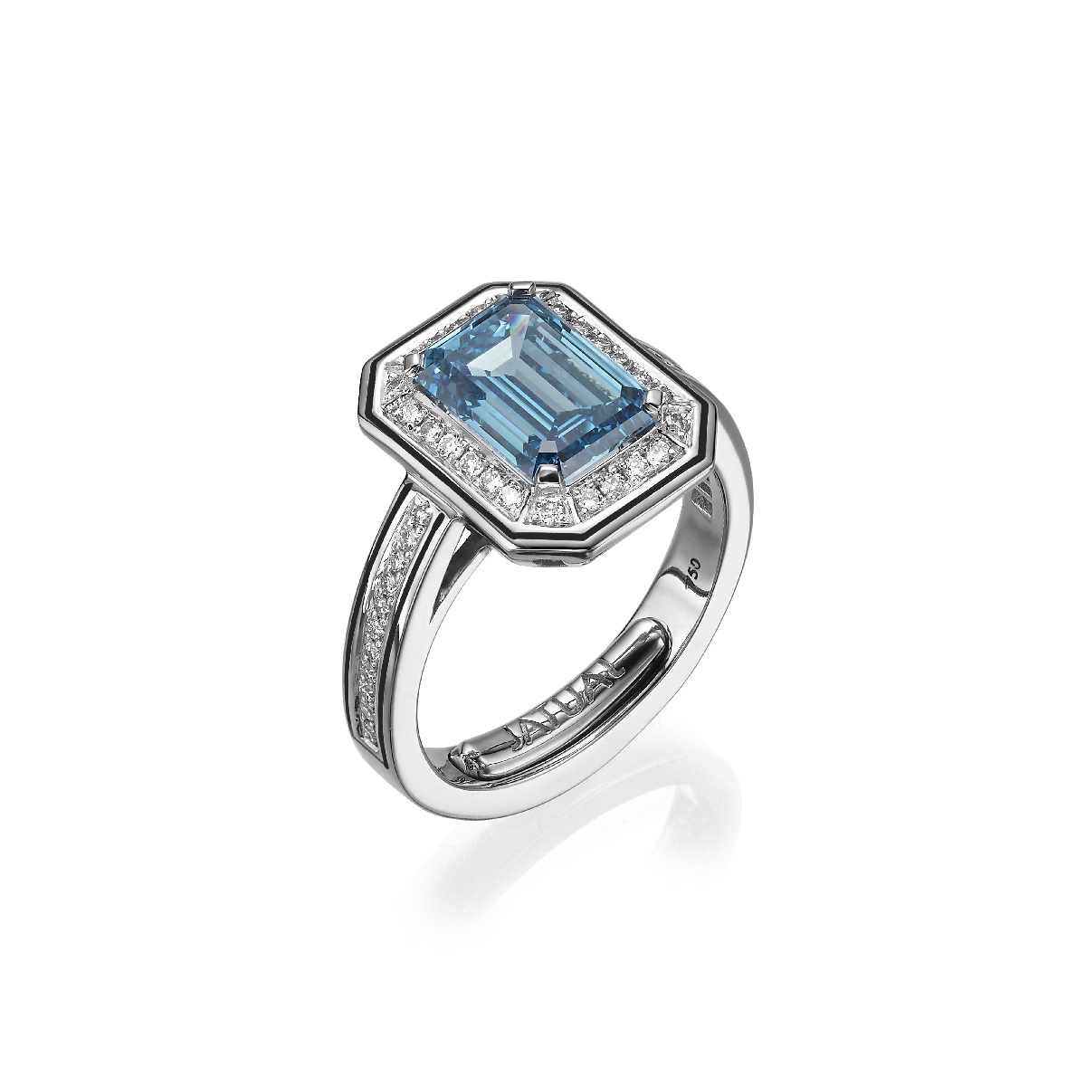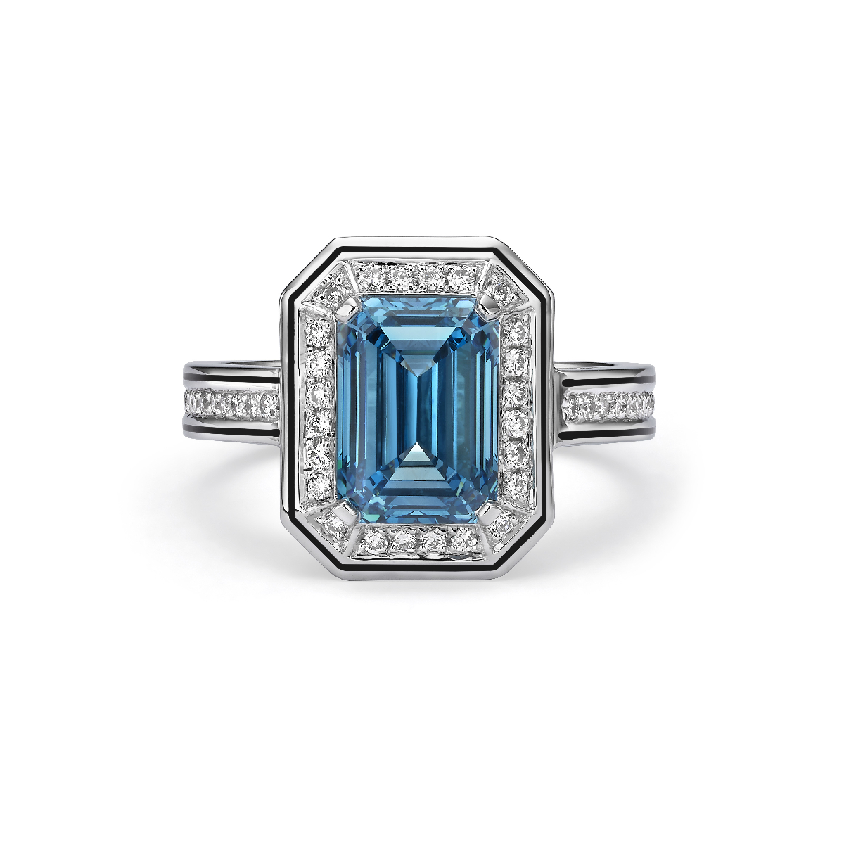 A whisper of 18K white gold embraces the deep, vivid blue of a 3.11 carat eco-diamond, a secret ocean reflecting light. Tiny brilliant stones illuminate its depths, crafting a timeless promise meant only for you. Total carat weight: 3.41 CT.