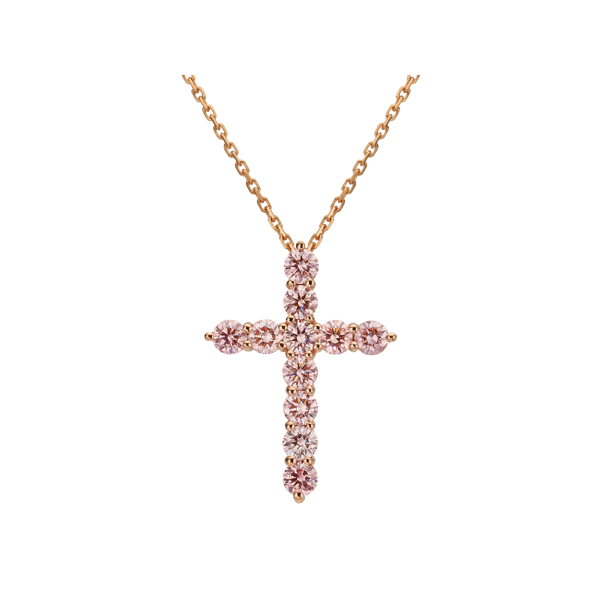 This 18K rose gold cross pendant is set with fancy vivid pink round brilliant lab-grown diamonds, accented by white lab-grown diamonds. The composition is clean and defined by contrast, totaling 3.79 carats.