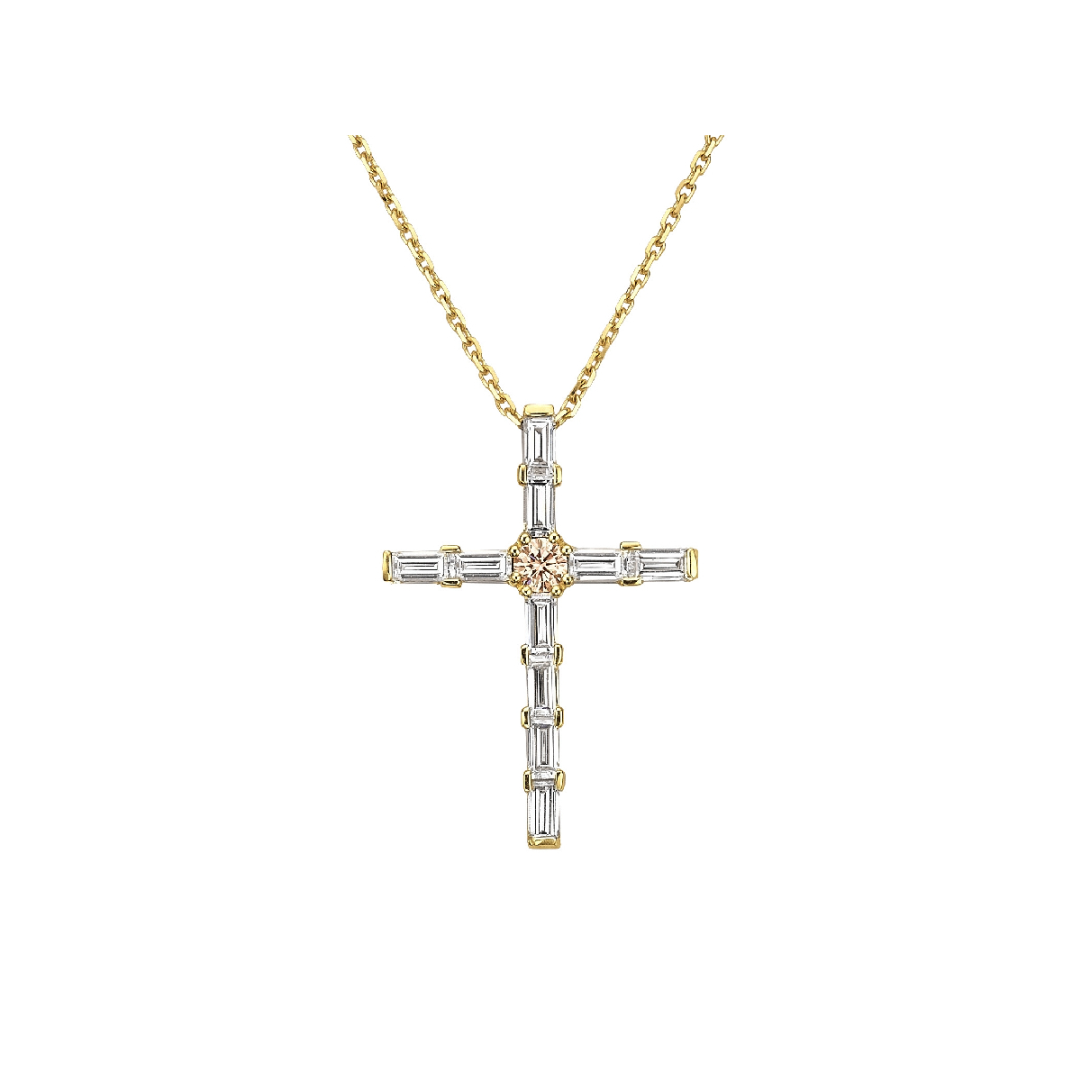 This 18K yellow gold pendant is set with a fancy vivid pink round brilliant lab-grown diamond, framed by baguette-cut white lab-grown diamonds. The composition is structured and balanced, totaling 2.55 carats.